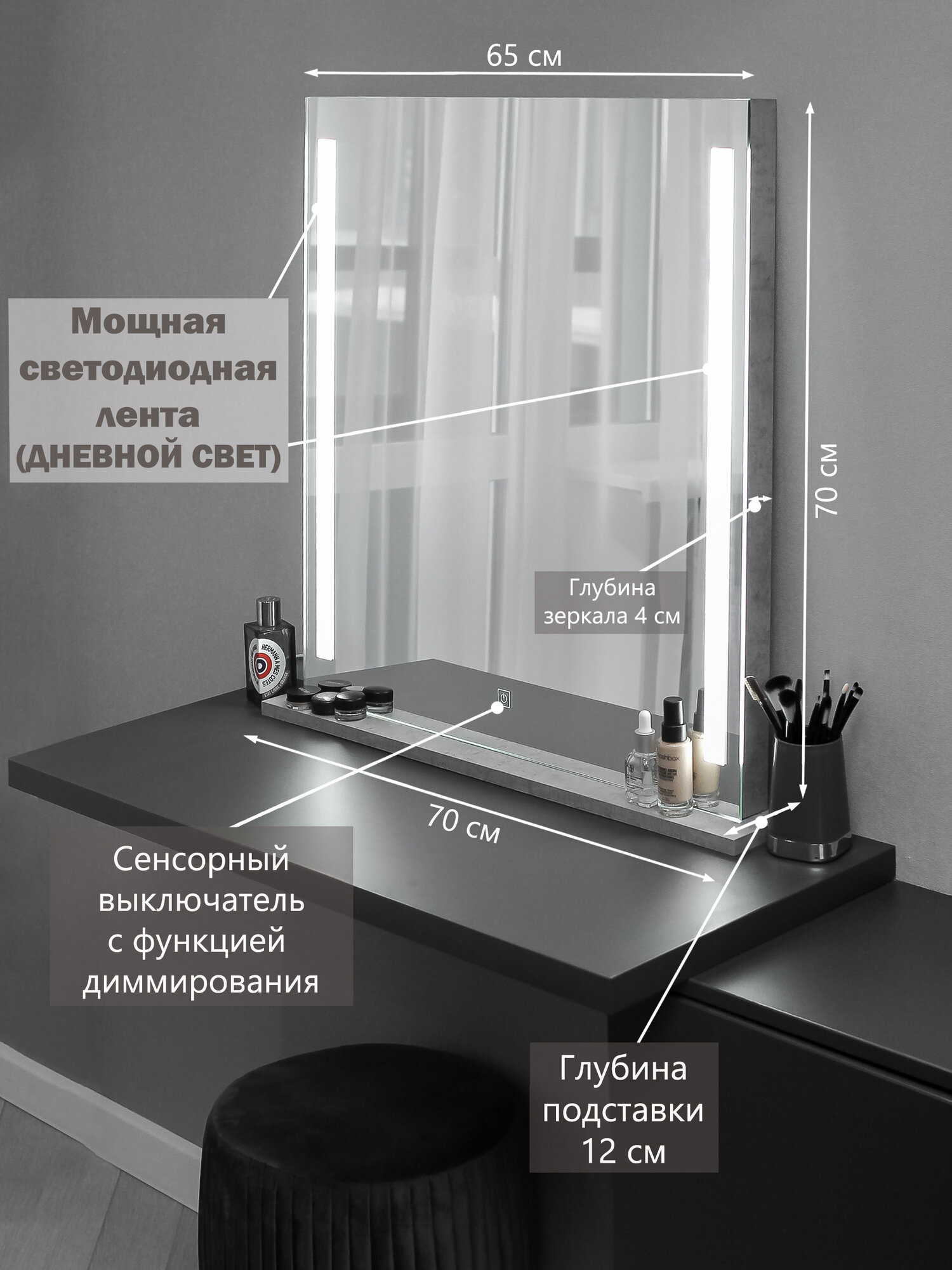 Зеркало макияжное на подставке, выключатель-сенсор LED II ЦЕМЕНТ информация: