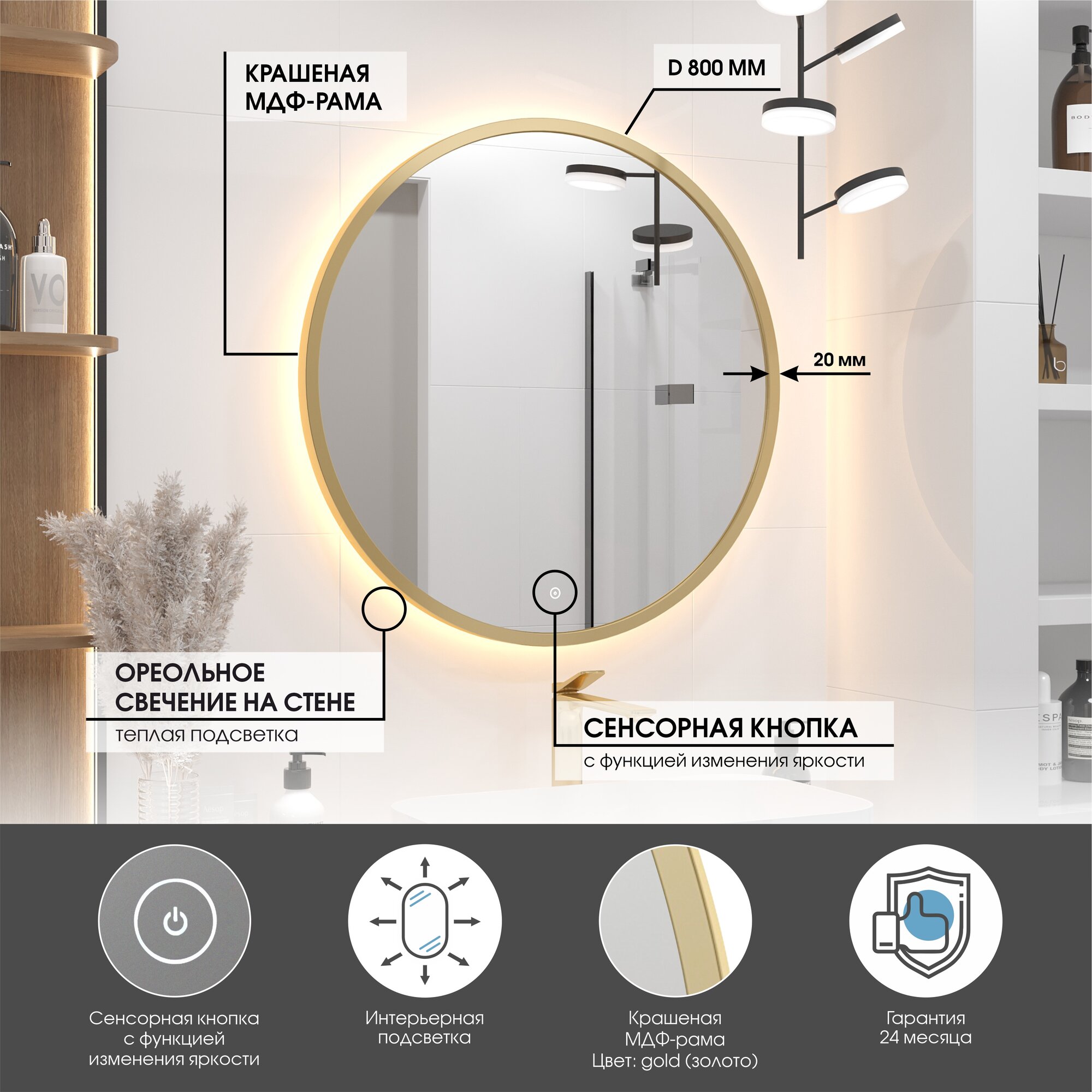 Зеркало в золотой раме D80 для ванной с тёплой подсветкой, сенсор с диммером, класс защиты IP44 Max Mirrors информация: