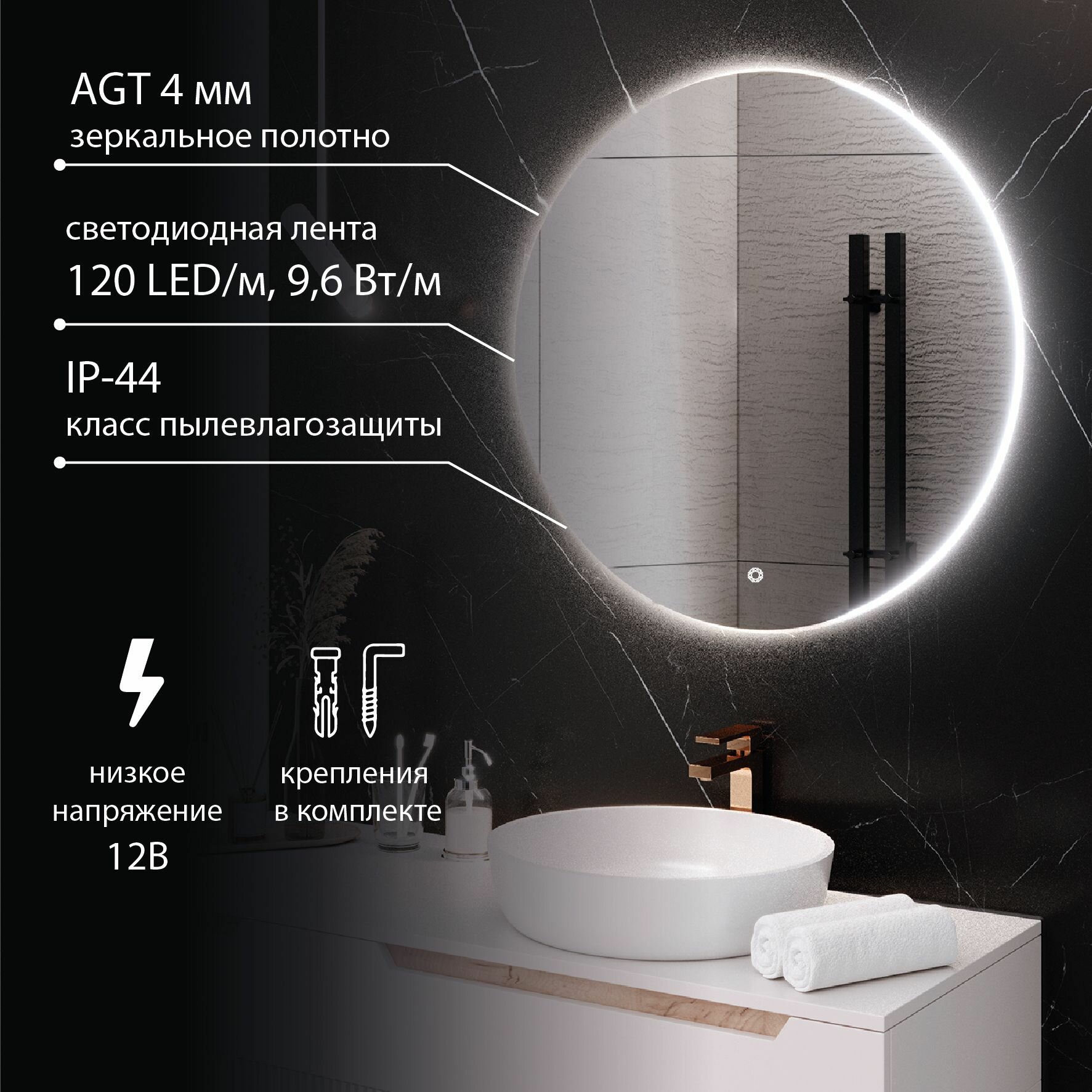 Зеркало круглое MILAN 77 см с подсветкой , сенсорный выключатель / AQUA DE MARCO информация: