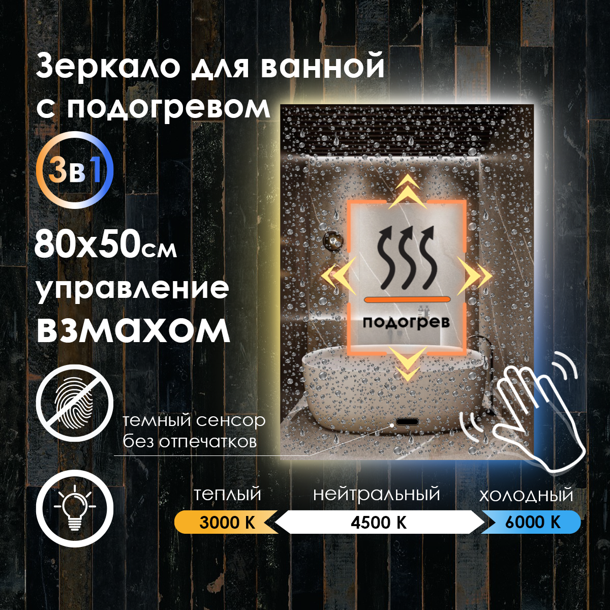 Зеркало для ванной прямоугольное, контурная подсветка, подогрев, управление взмахом руки, 80х50 см. информация: