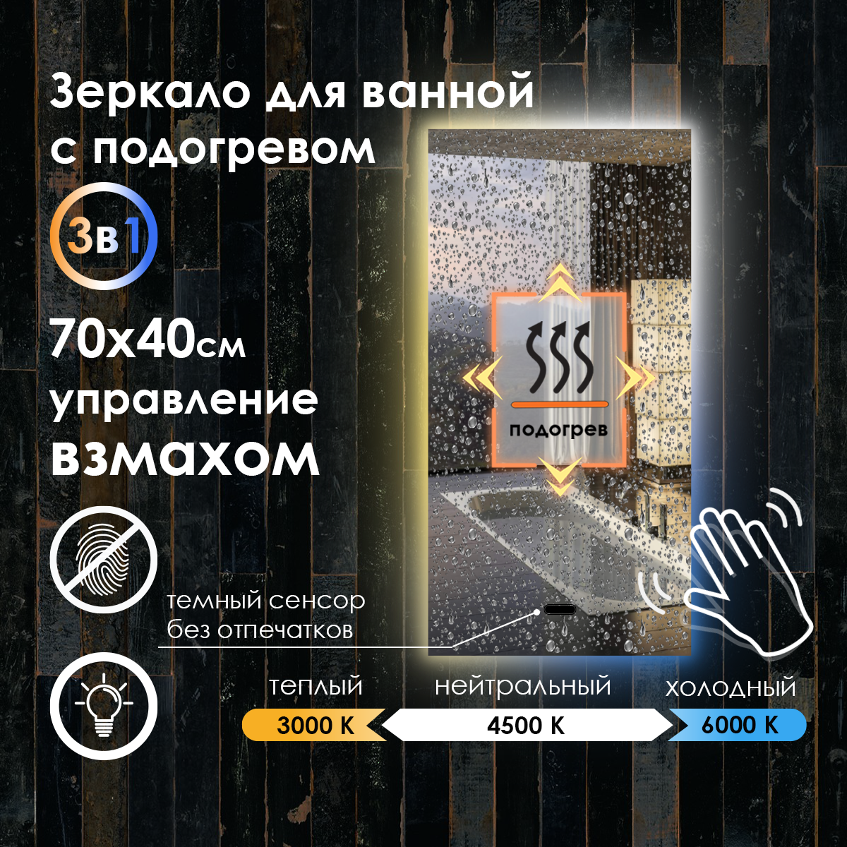 Зеркало для ванной прямоугольное, контурная подсветка, подогрев, управление взмахом руки, 70х40 см. информация: