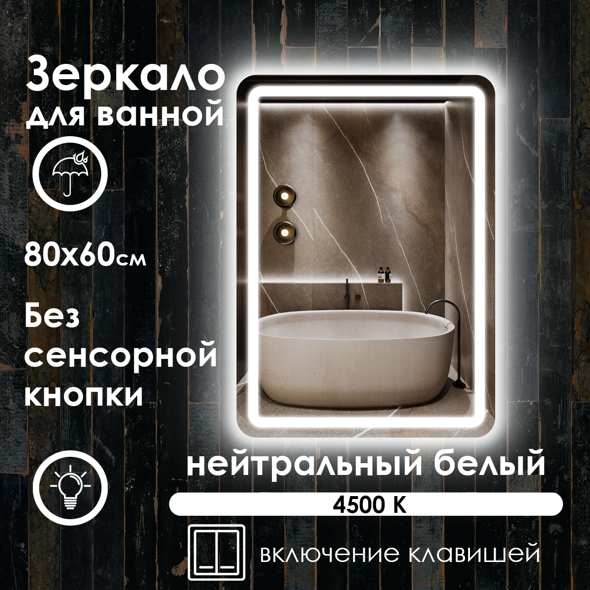 Зеркало настенное Maskota для ванной прямоугольное скругленное, с фронтальной подсветкой, без сенсора, 80х60 см информация: