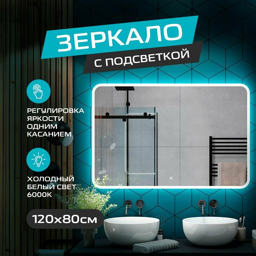 10 цен на Зеркало с ореольной LED подсветкой в ванную комнату 120*80 см (холодный свет 6000К, прямоугольное настенное для ванной сенсорное выключение)