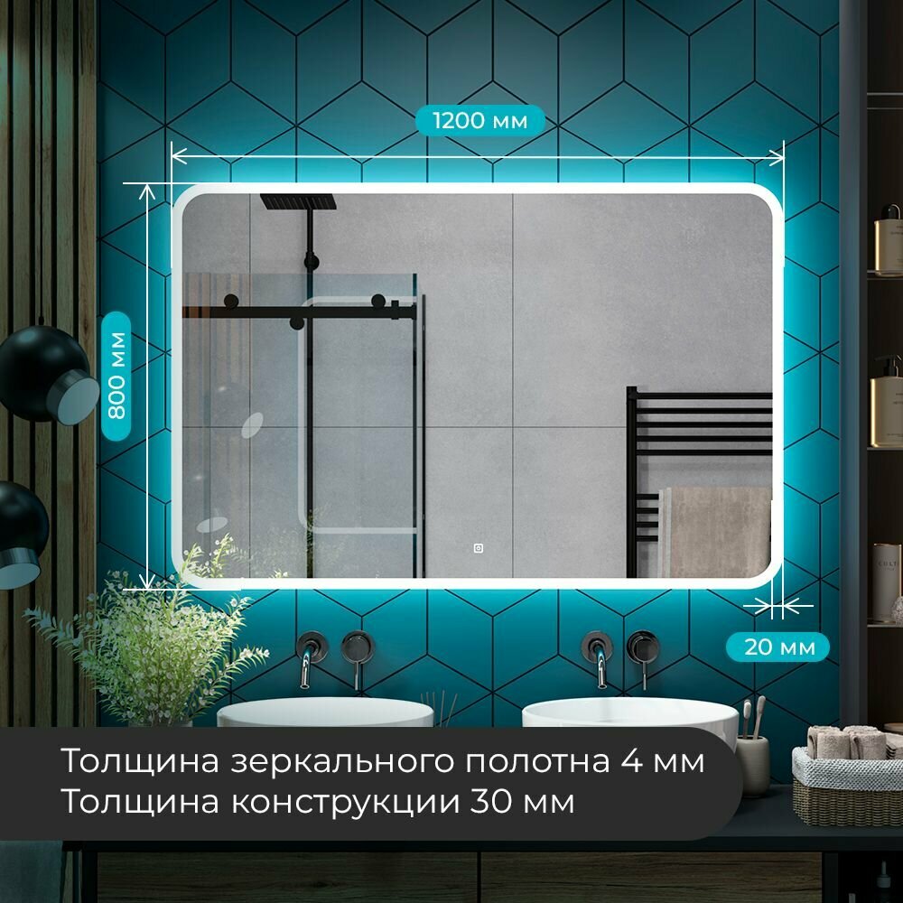 Зеркало с ореольной LED подсветкой в ванную комнату 120*80 см (холодный свет 6000К, прямоугольное настенное для ванной сенсорное выключение) информация: