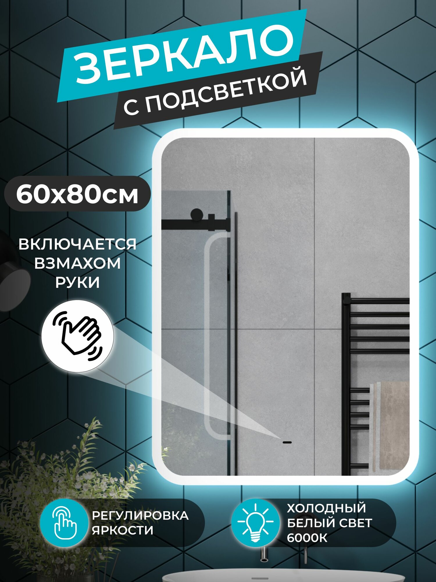 Зеркало с ореольной LED подсветкой в ванну комнату 60*80 см (холодный свет 6000К, прямоугольное настенное для ванной с бесконтактным сенсором) информация: