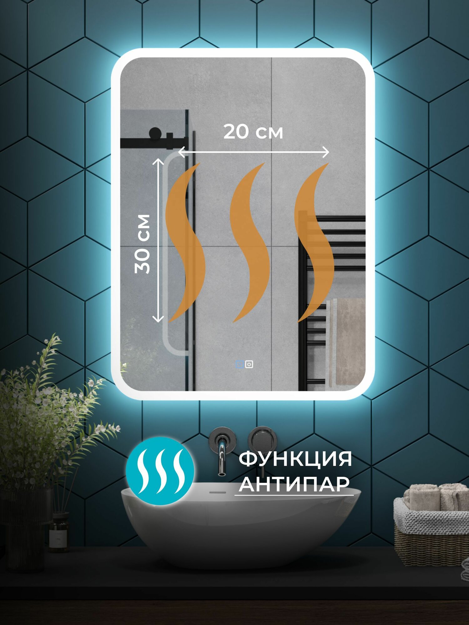 Отзывы на Зеркало с ореольной LED подсветкой в ванную комнату 50*60 см (холодный свет 6000К, прямоугольное настенное для ванной сенсорное выключение с подогревом )