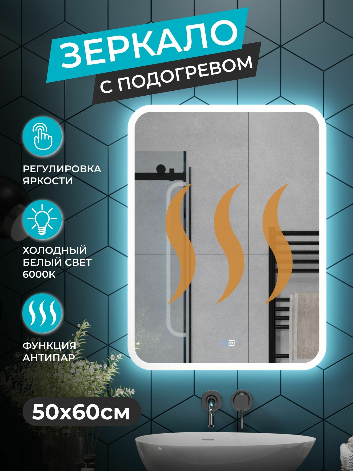 Зеркало с ореольной LED подсветкой в ванную комнату 50*60 см (холодный свет 6000К, прямоугольное настенное для ванной сенсорное выключение с подогревом ) информация: