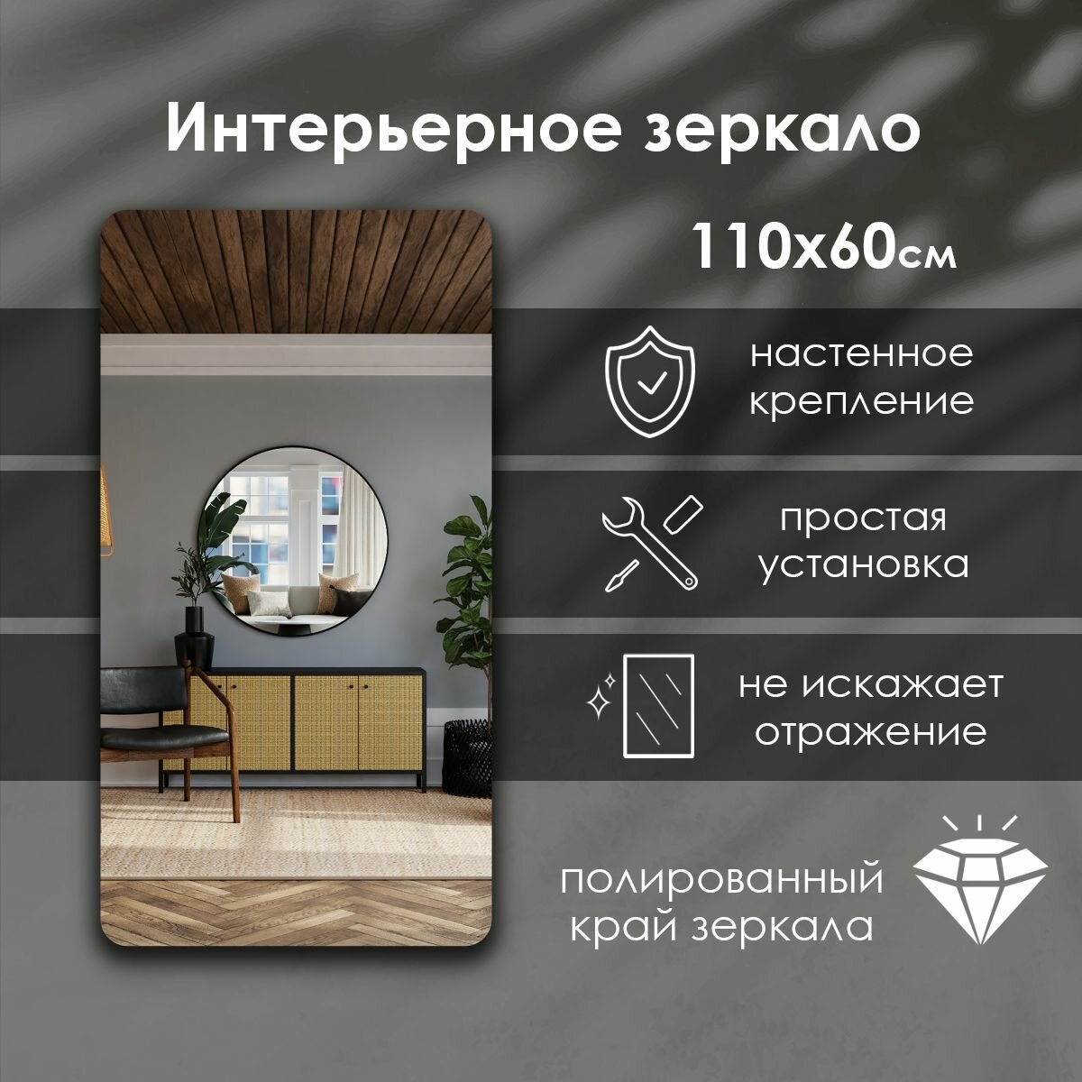 Интерьерное зеркало Сфера Отражения "Lexa", настенное, прямоугольное с закруглёнными углами , ударопрочное, 130x100см 9 121 ₽