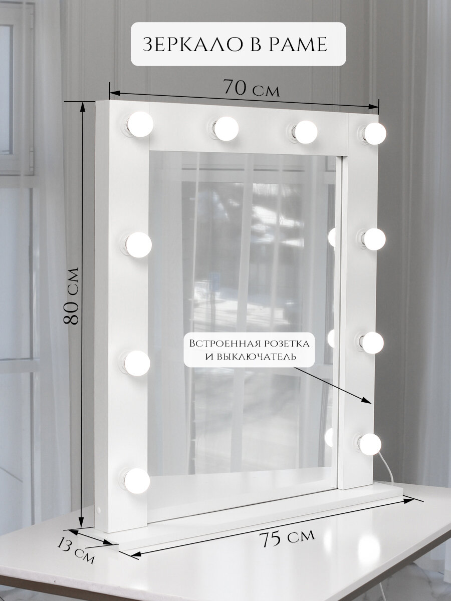 Гримерное зеркало на подставке в раме 80*70см с выключателем и розеткой белое информация: