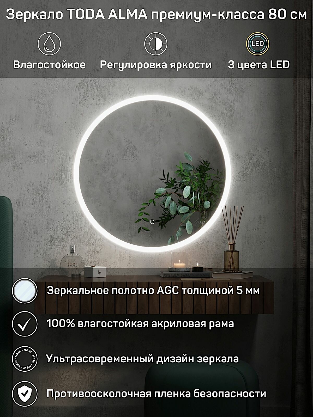 Отзывы на Зеркало интерьерное круглой формы настенное в раме белое 80 см с подсветкой для прихожей или спальни, TODA ALMA