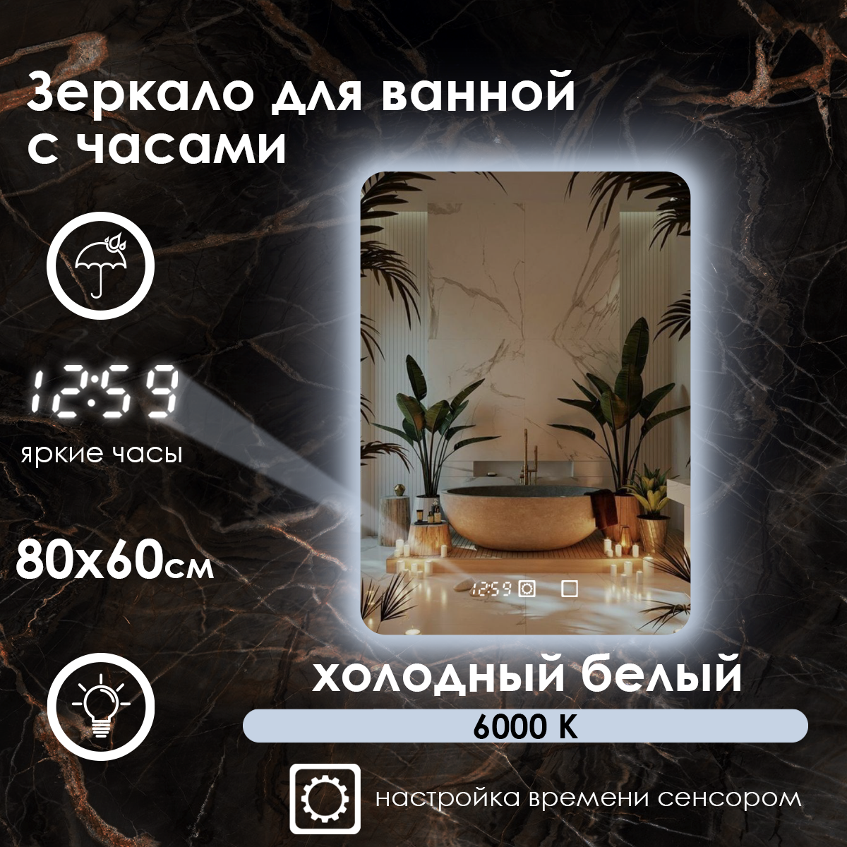 10 цен на Зеркало настенное Maskota для ванной прямоугольное скругленное, с парящей подсветкой на стену 6000К, часами, 80х60 см