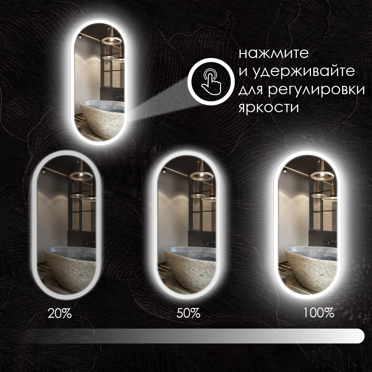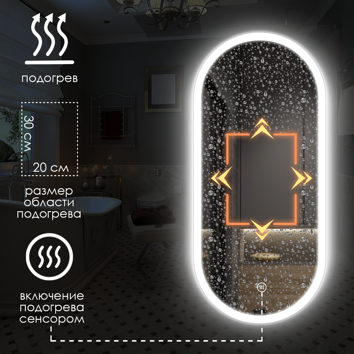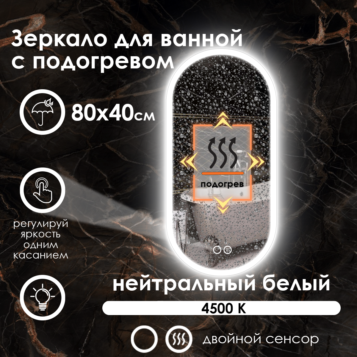 Зеркало для ванной Maskota Elen с нейтральной фронтальной подсветкой, сенсор, диммер, подогрев, IP44, 80х40 см информация: