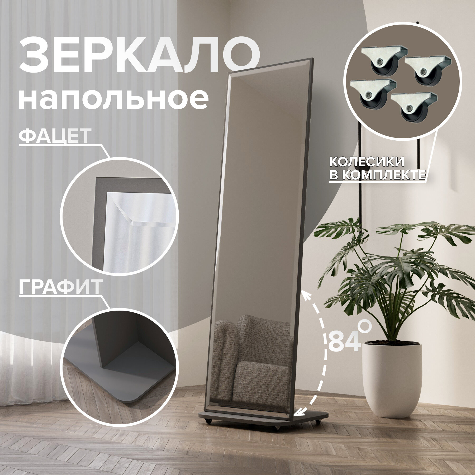 Зеркало напольное квадратное с фацетом в полный рост, интерьерное, 50х163,5 графит цвет информация: