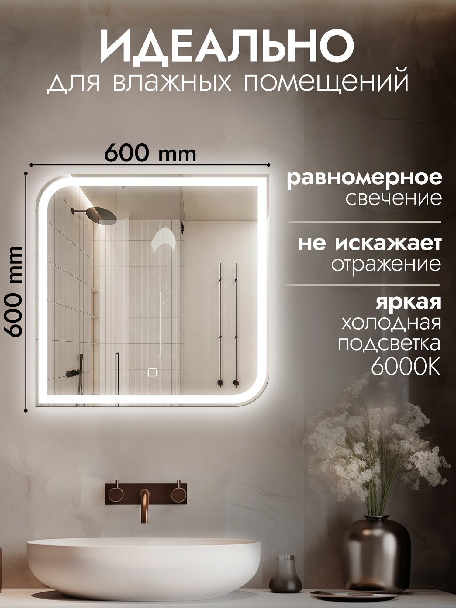 Настенное зеркало с подсветкой в ванную Montreal 60х60 см (ореольная подсветка, холодный свет 6000К, сенсорное управление, прямоугольное зеркало для ванной) информация: