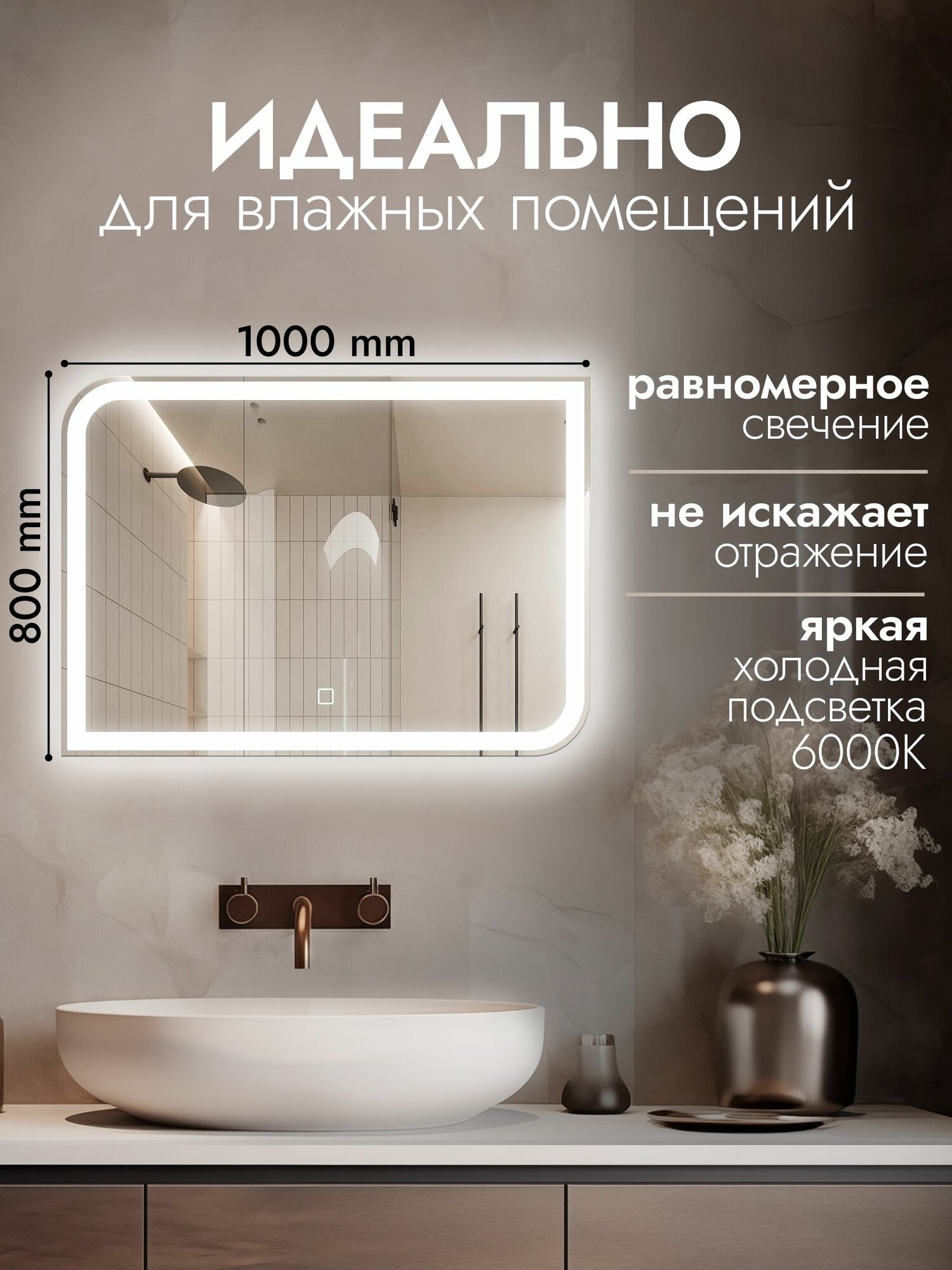 Отзывы на Настенное зеркало с подсветкой в ванную Montreal 100х80 см (ореольная и фронтальная подсветка, холодный свет 6000К, сенсорное управление, прямоугольное зеркало для ванной)