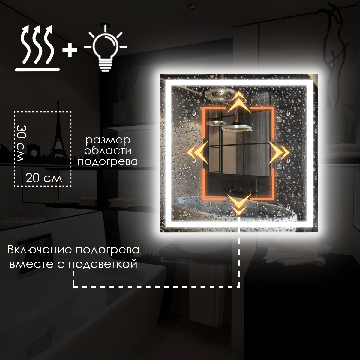 Отзывы на Зеркало для ванной квадратное, фронтальная подсветка, нейтральный свет 4500K, подогрев, без сенсора, 70х70 см.