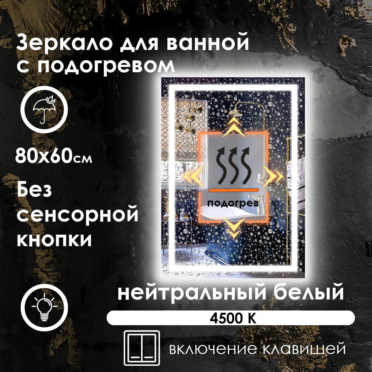 Зеркало для ванной прямоугольное, фронтальная подсветка, нейтральный свет 4500K, подогрев, без сенсора, 80х60 см. информация: