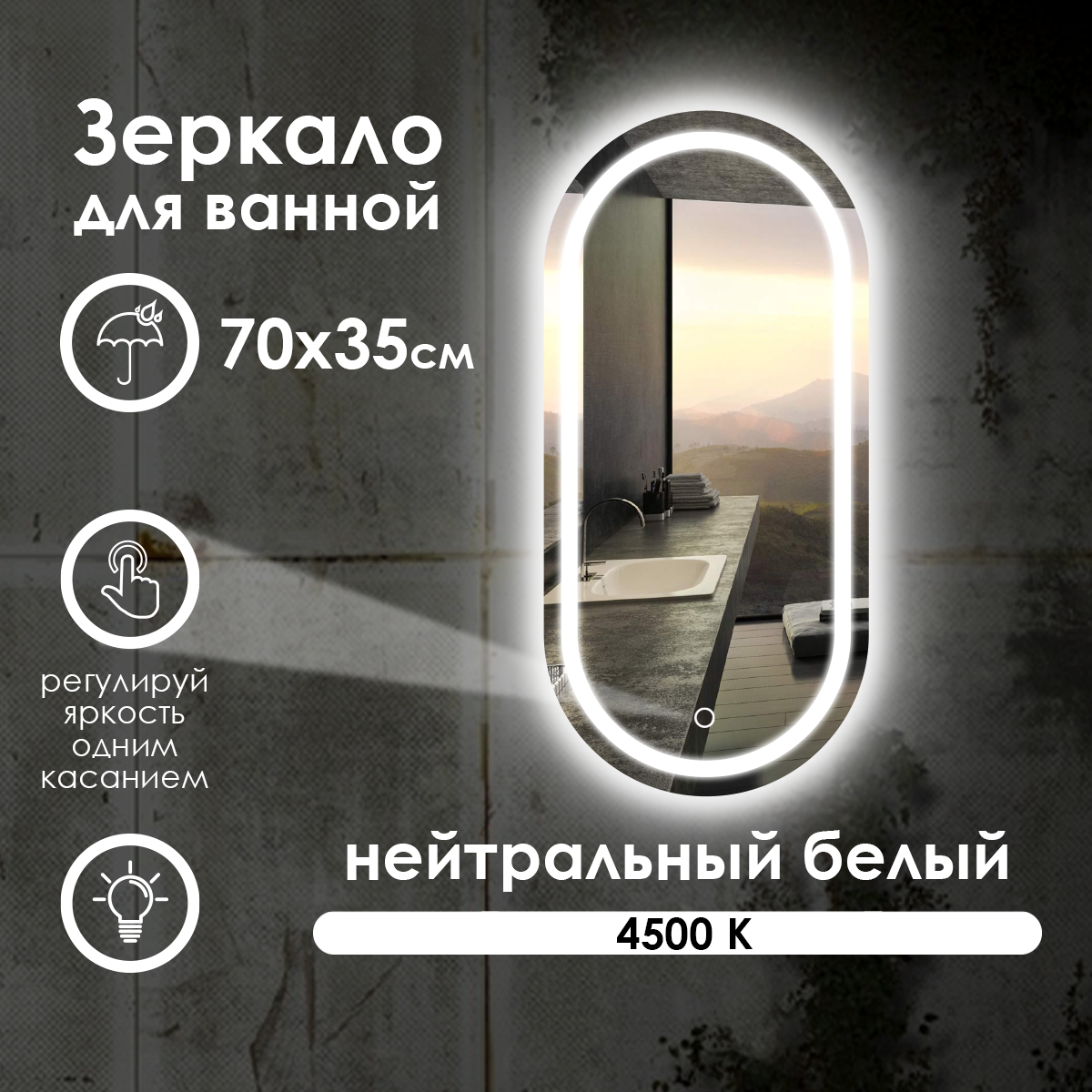 Зеркало для ванной Maskota Elen с нейтральной фронтальной подсветкой, сенсор, диммер, IP44, 70х35 см информация: