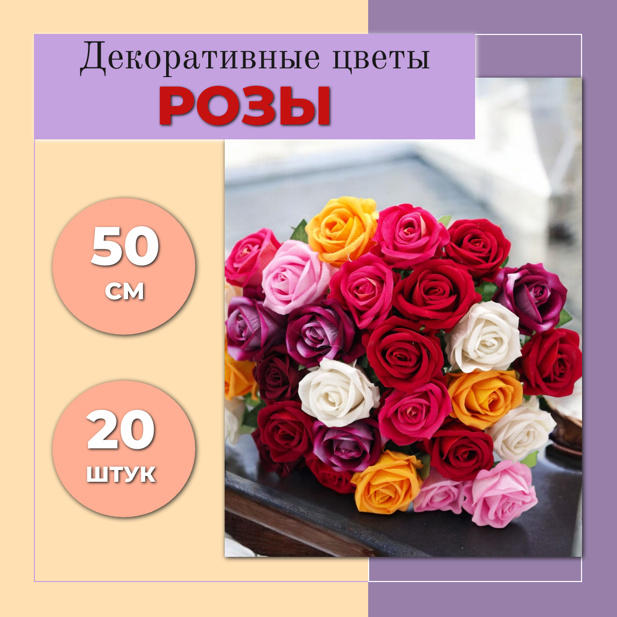 Цветы Розы (CV25) декоративные, искусственные, интерьерные 20 штук, 50см, разноцветный информация: