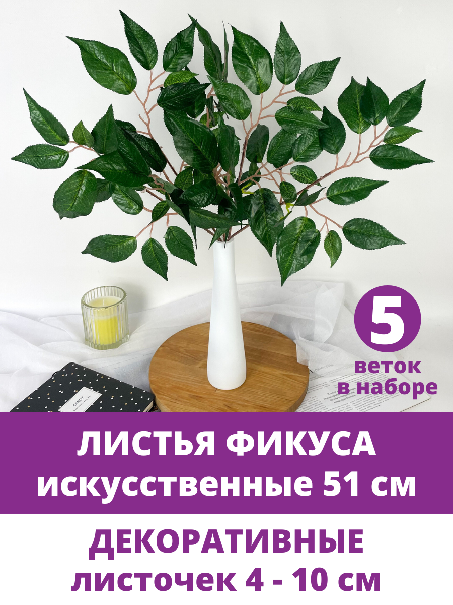 Отзывы на Листья Фикуса, искусственный букет, Зеленый 51 см, листочки 4,5 - 10 см, набор 5 веток