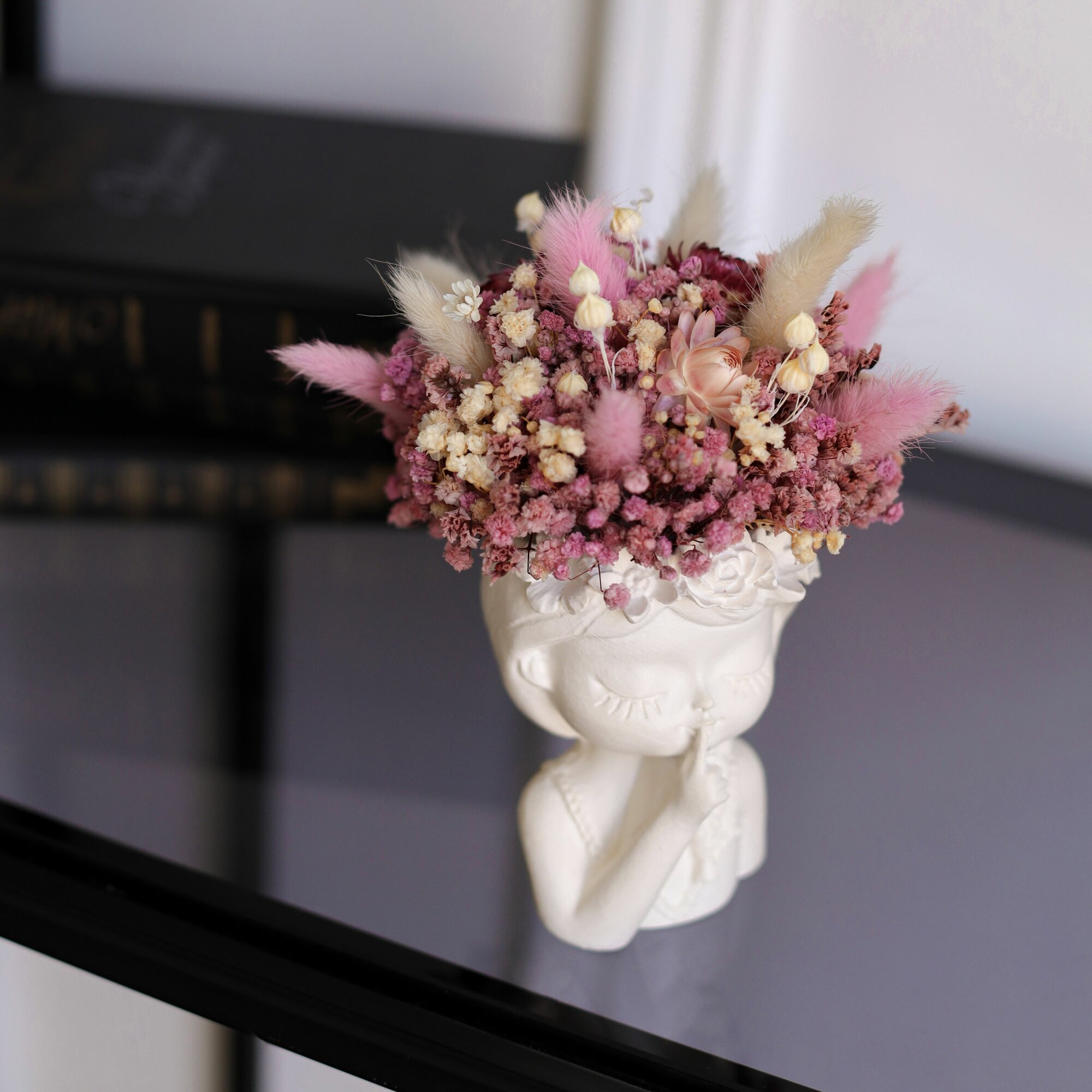 Интерьерная композиция из сухоцветов и стабилизированных цветов в гипсовом кашпо информация: