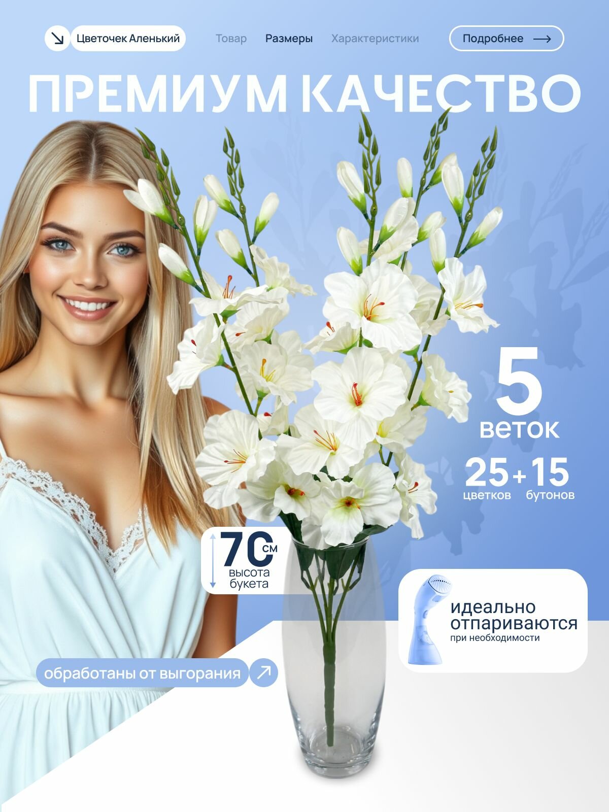 Гладиолусы искусственные цветы, белый, 70 см, 5 веток/ букет информация: