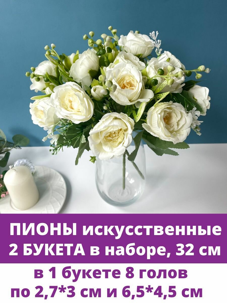 Пионы Белые искусственные евро, букет 32 см, 8 голов, набор 2 шт. информация: