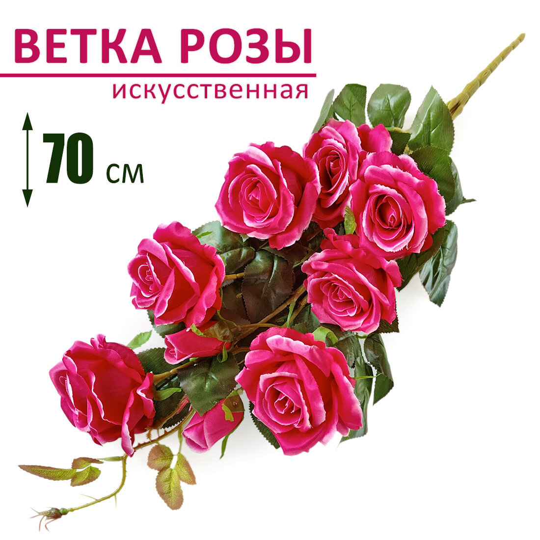 Ветка розы искусственная большая для декора, 70 см. Цвет: Ярко-розовый информация: