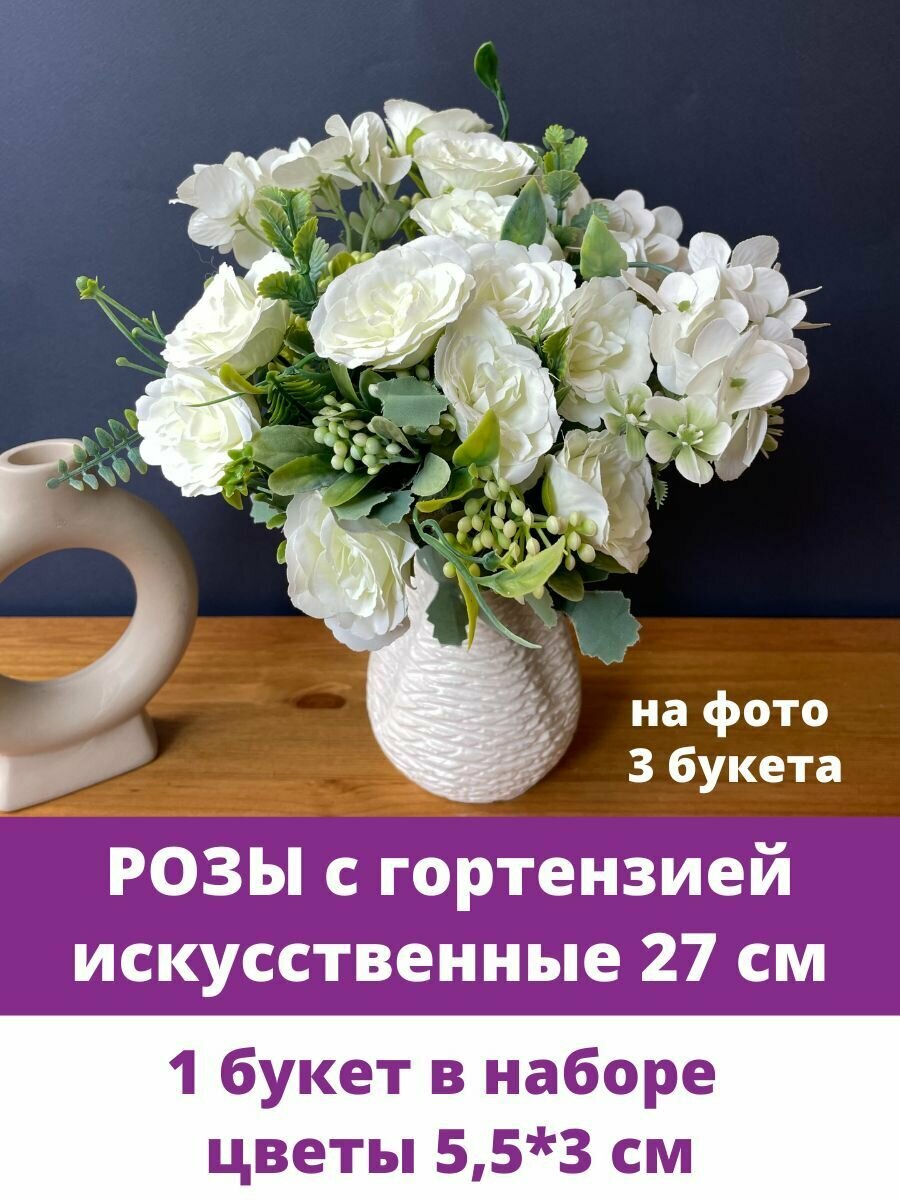 10 цен на Розы искусственные с гортензией, Букет цветов, Белые 27 см, 1 букет
