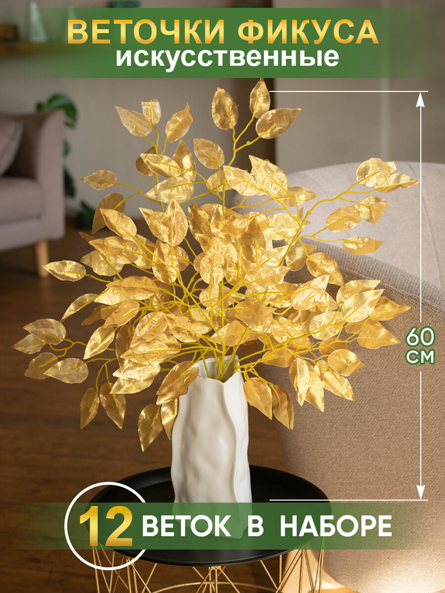 10 цен на Цветы искусcтвенные для декора, Магазин искусственных цветов №1, Набор из 12-ти веток Фикуса, золотой, текстиль