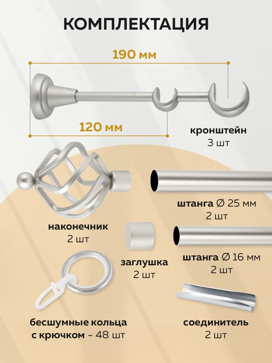 Карниз для штор настенный круглый двухрядный металлический бесшумный 240см Mirtex Premium Сатин 25/16мм составной гладкий, гардина для штор 4 700 ₽