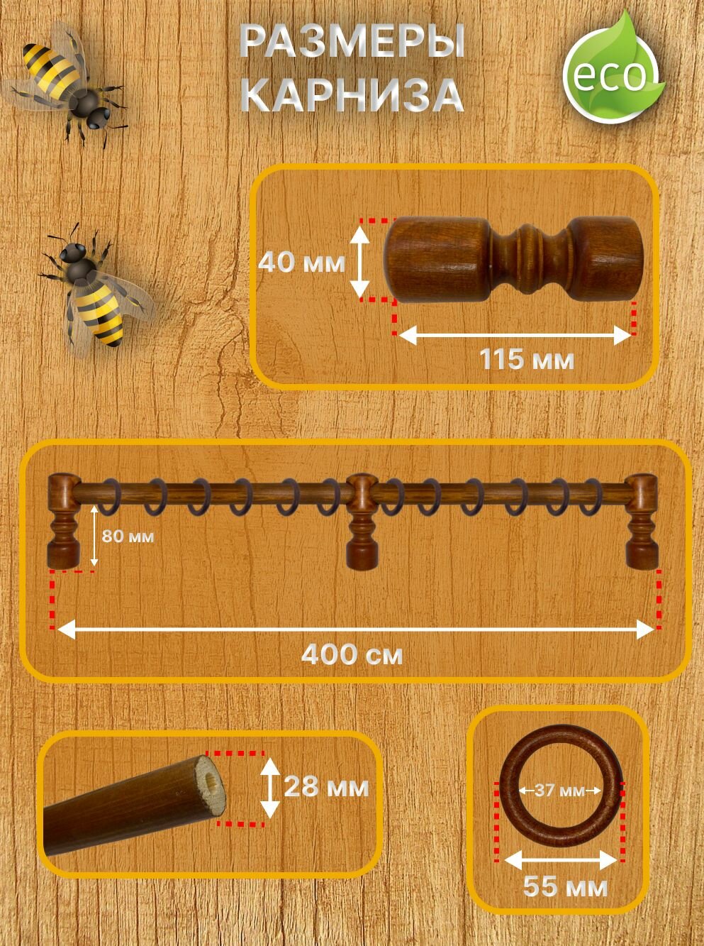 Кольца для карниза (дерево) с крючками на карниз д 28 мм-20шт