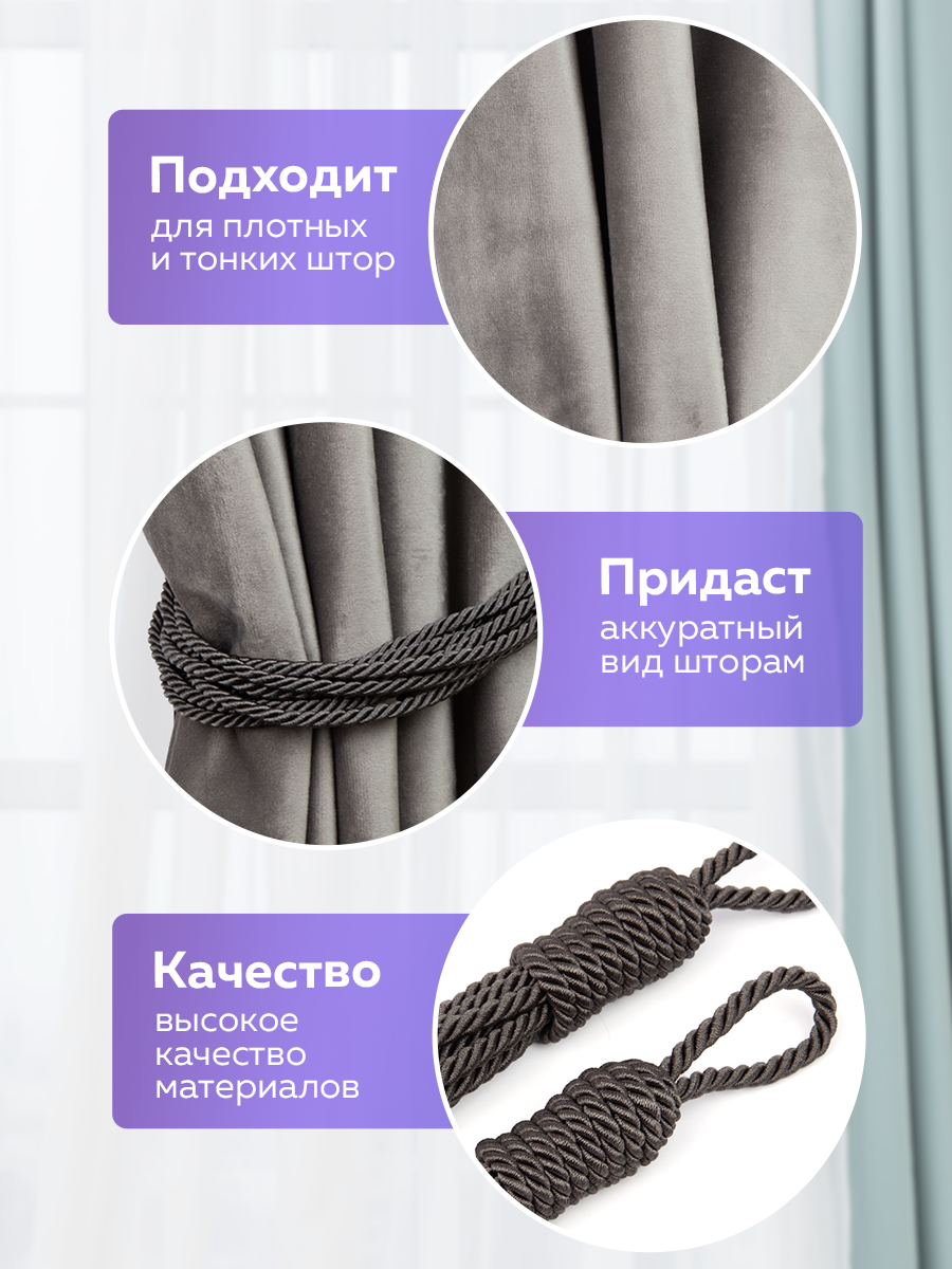 10 цен на Подхваты для штор с подвесками и шнуровкой Mirtex Каскад, графит, 73 см, текстиль