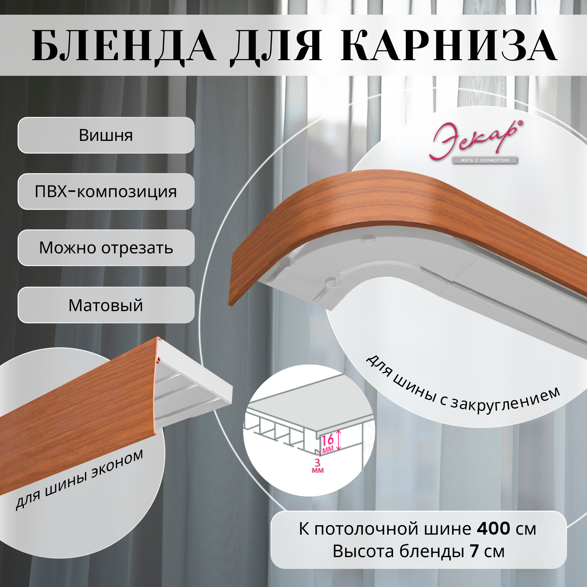 Отзывы на Бленда для карниза 400 см, цвет вишня, ширина 7 см, размер замка 16 мм, пластиковая для потолочной шины