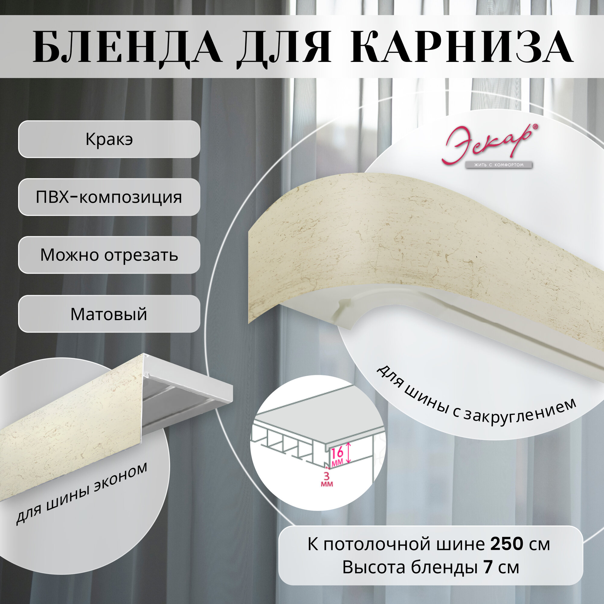 Бленда для карниза 250 см, Кракэ, ширина 7 см, размер замка 16 мм, пластиковая для потолочной шины информация: