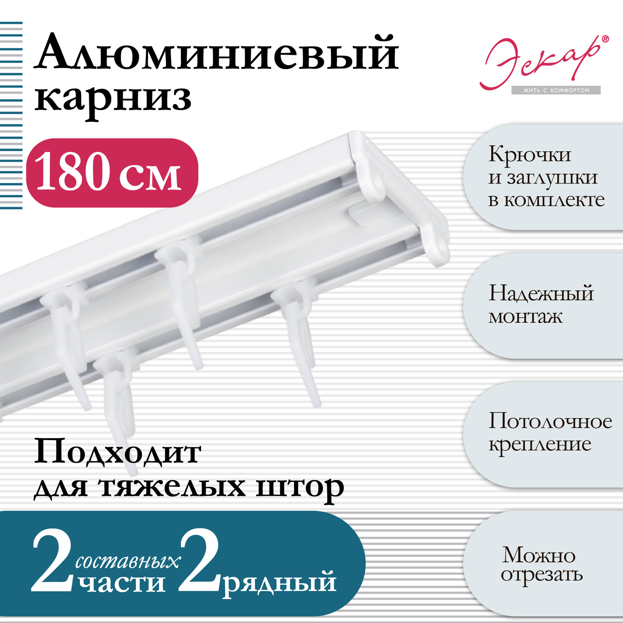 Карниз алюминиевый двухрядный, "Эскар", составной (2 части), длина 180 см, белый информация: