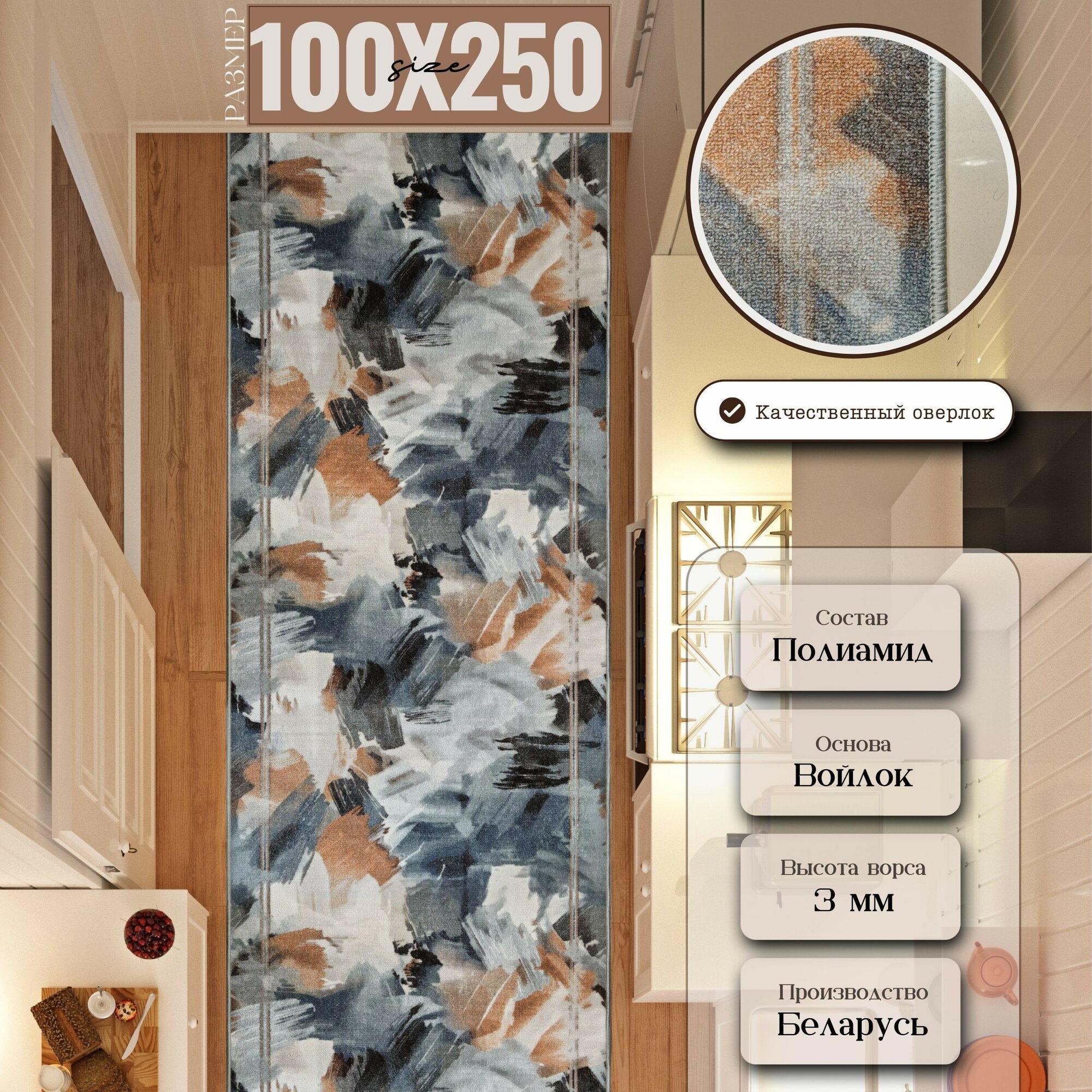 Ковровая дорожка на отрез без ворса "Акварель" 100х250 см + оверлок торцов информация: