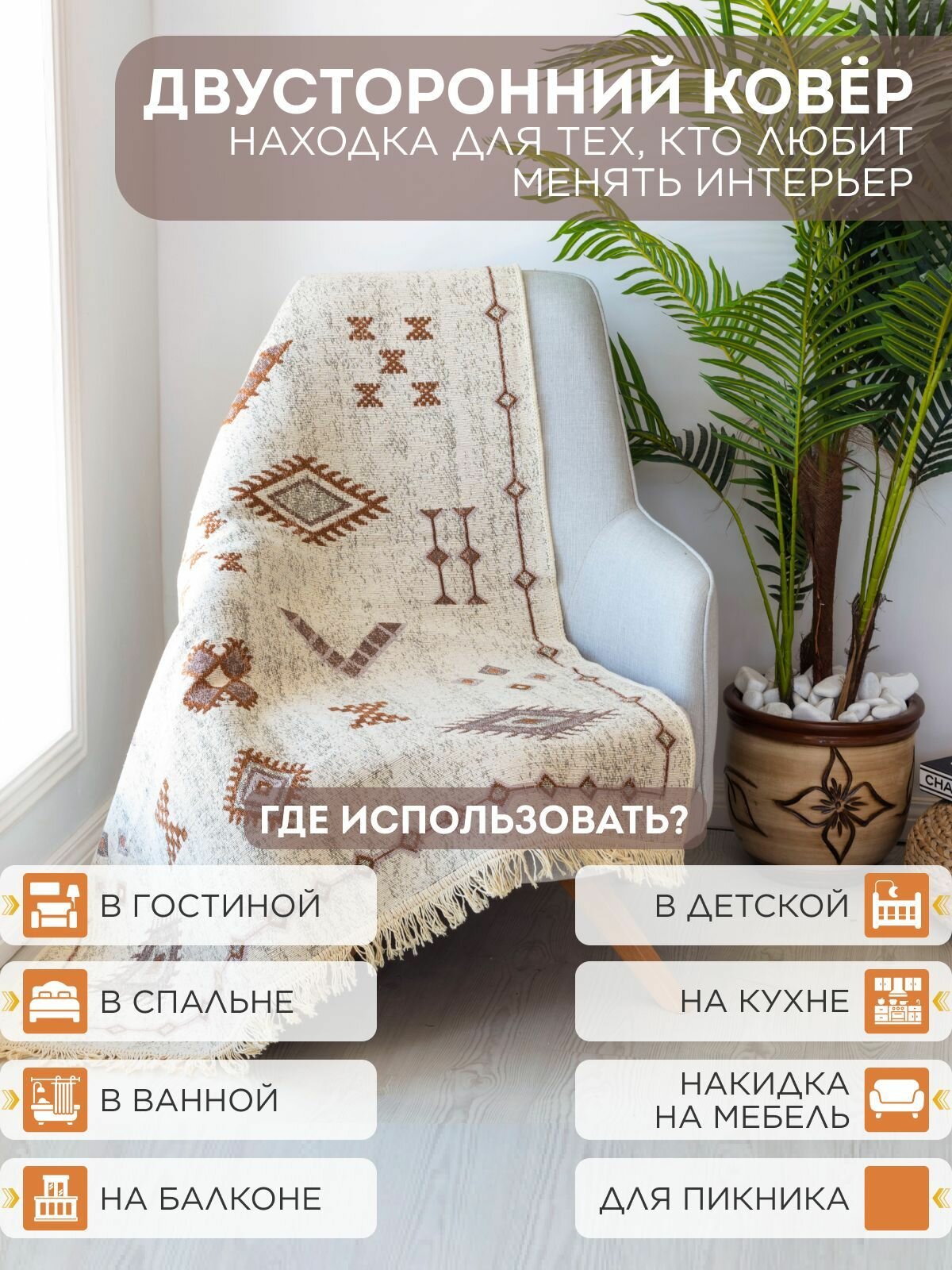Ковер на пол двусторонний 80х200 см, натуральный хлопок, бежевый/коричневый информация: