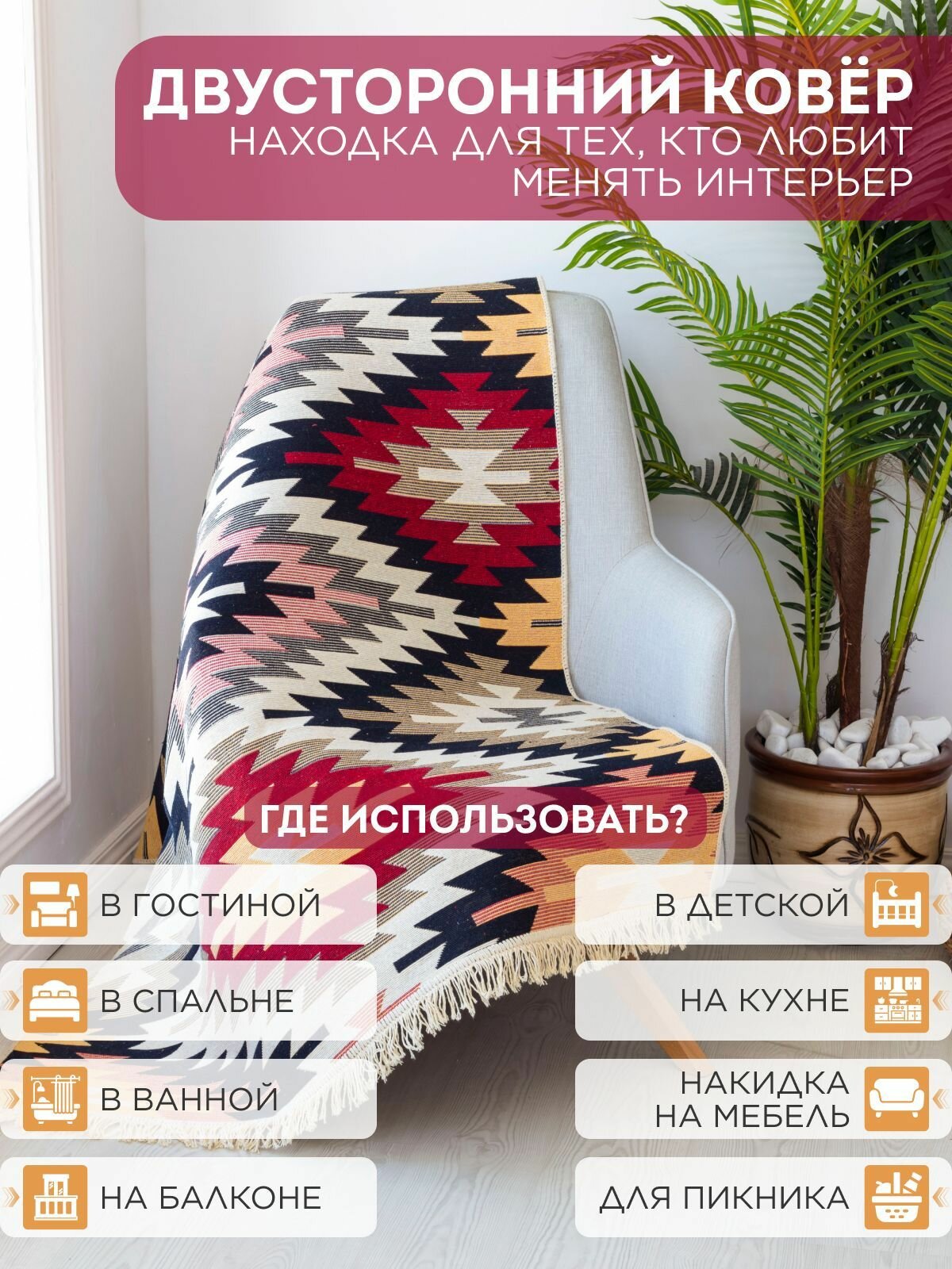 Отзывы на Ковер на пол двусторонний 80х200 см, натуральный хлопок, разноцветный