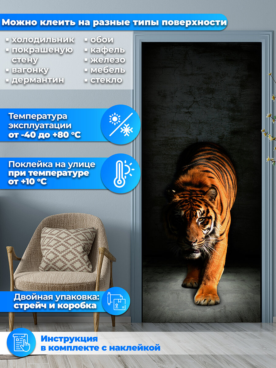 Отзывы на Наклейка интерьерная на дверь "Дикий, притаившийся во тьме тигр", самоклеющаяся 80х200 см.