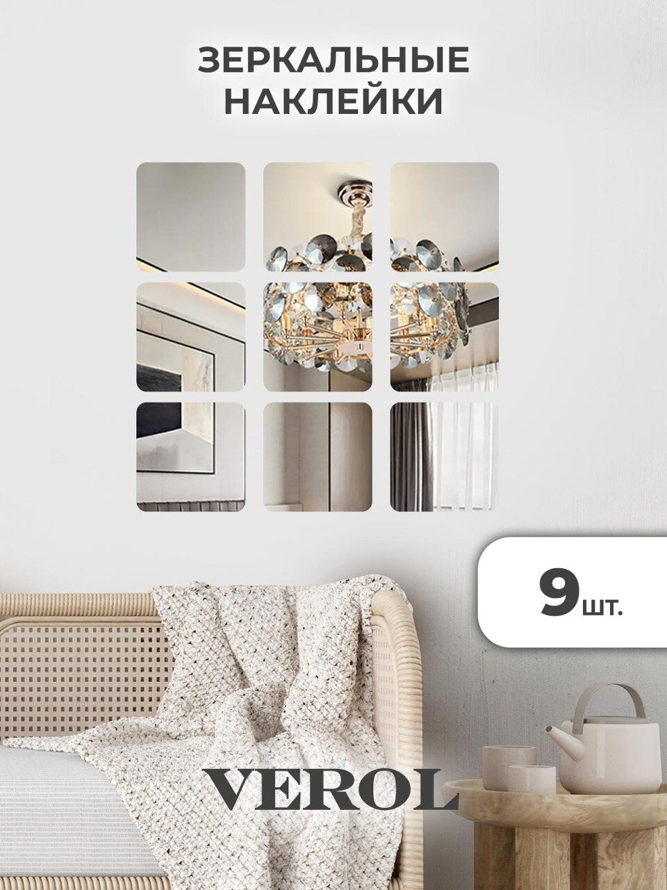 Зеркальные наклейки на стену VEROL «Квадрат», 9 шт, 15х15 см, декор для дома информация: