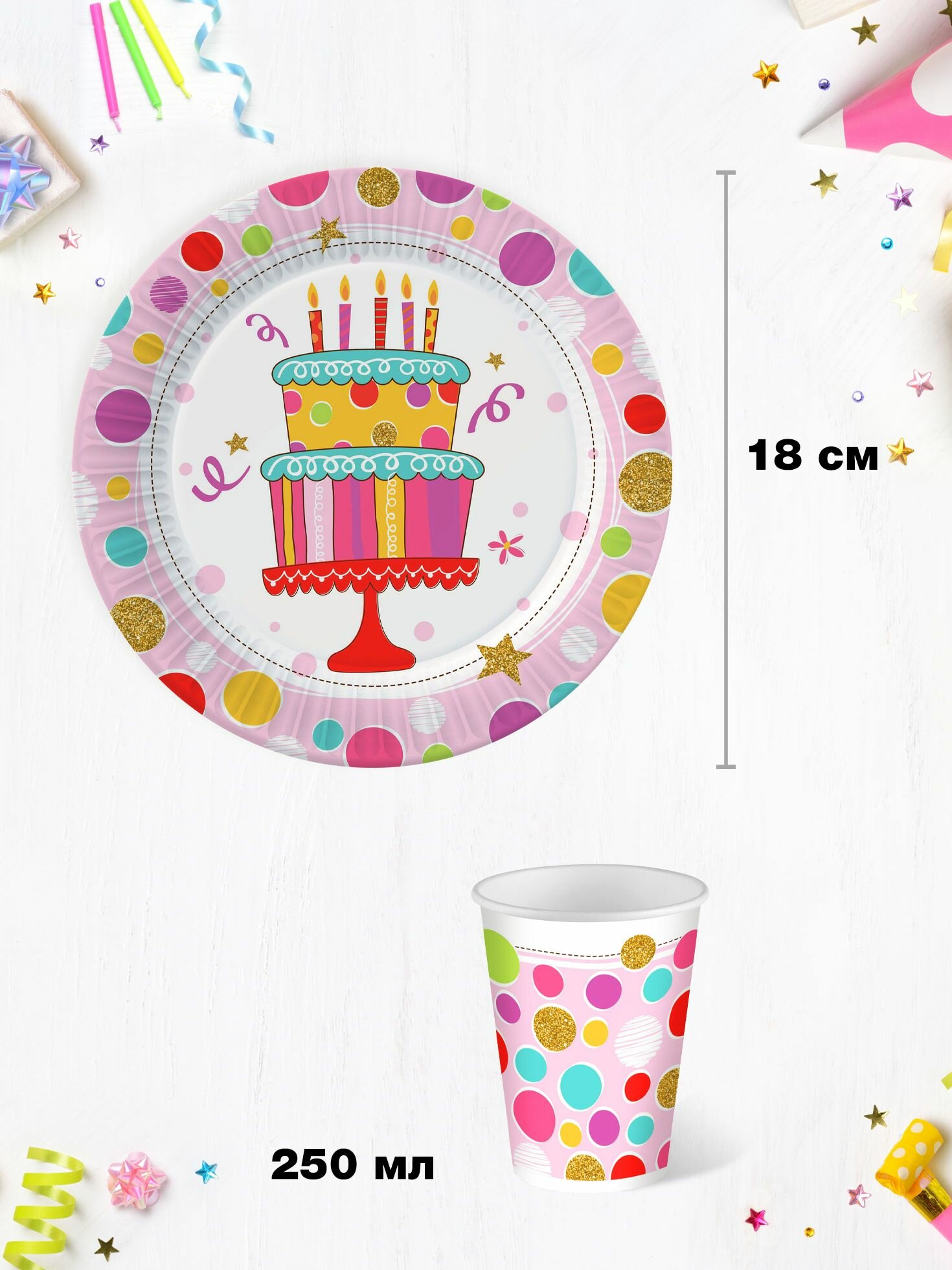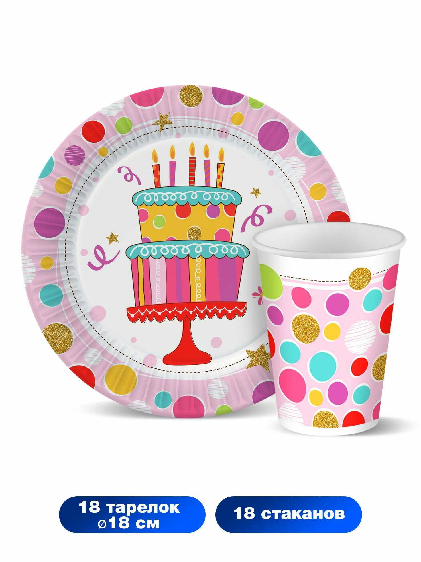 Набор одноразовой бумажной посуды для праздника ND Play / Тортик (стакан, тарелка 18 см, по 18 шт.) информация: