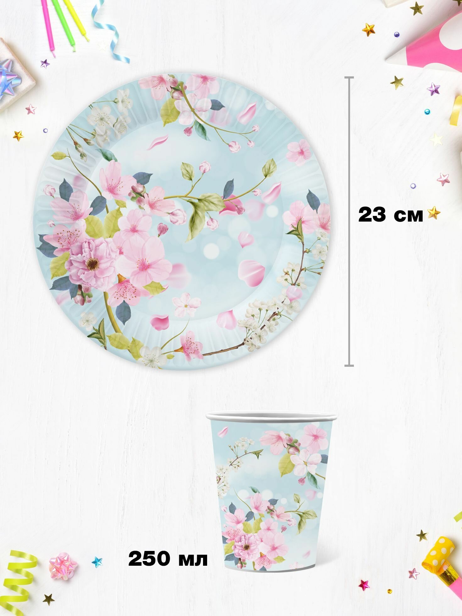 Набор бумажной одноразовой посуды для праздника ND Play / Яблоневый цвет (тарелка 23 см, стакан, по 12 шт.) информация: