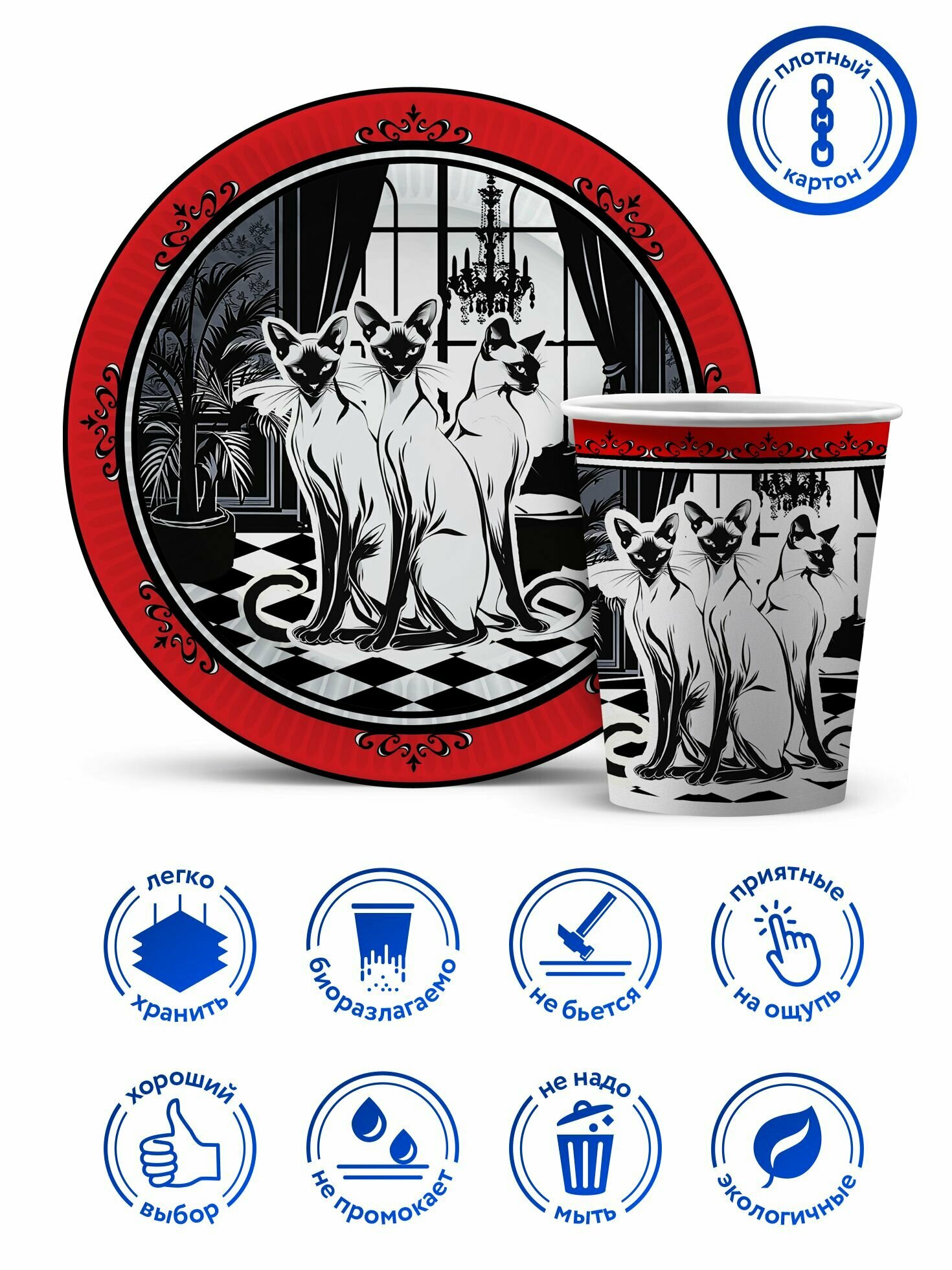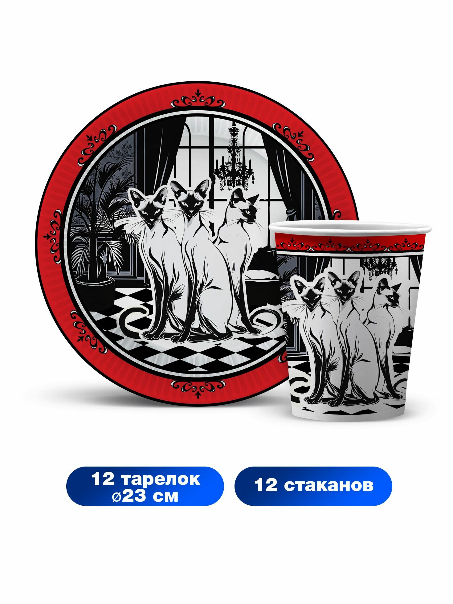 Набор одноразовой бумажной посуды для праздника ND Play / Котики нуар (тарелка 23 см, стакан, по 12 шт.) информация: