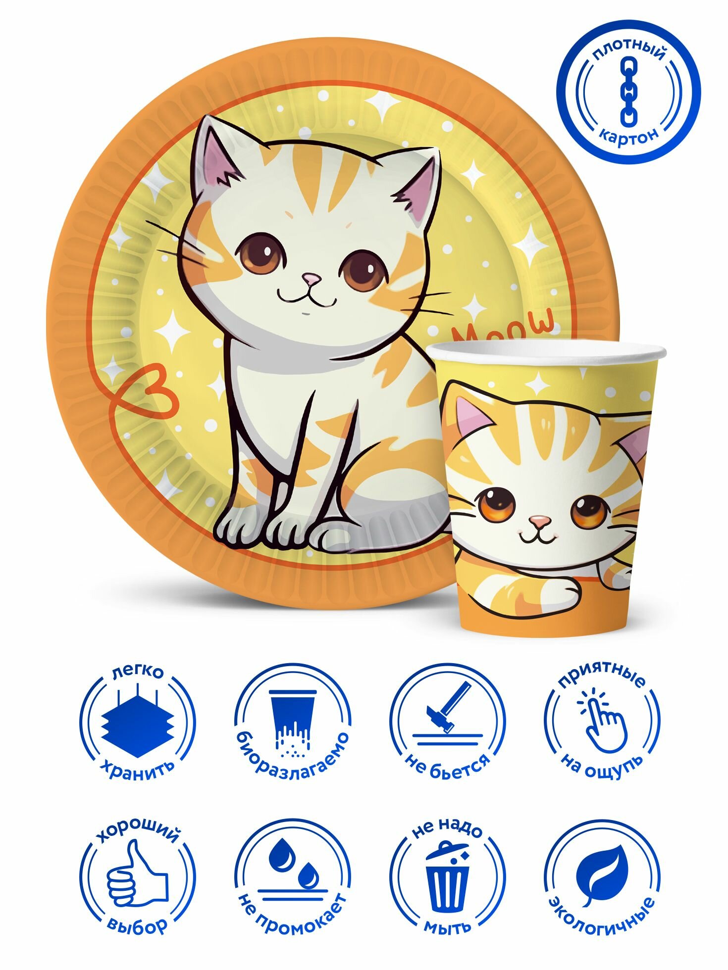 Набор одноразовой бумажной посуды для праздника ND Play / Котик полосатый (тарелка 23 см, стакан, по 12 шт.) информация: