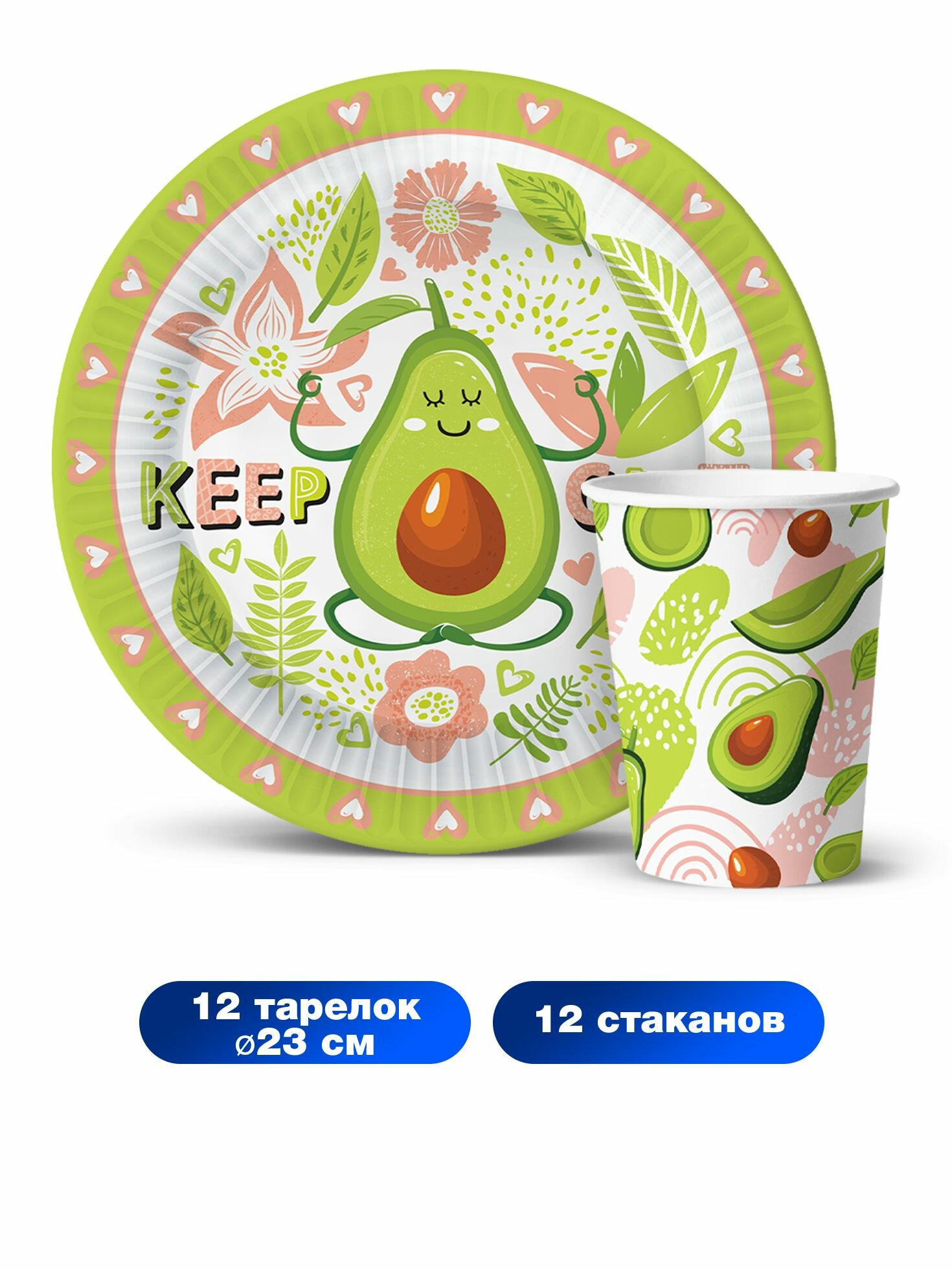 Набор одноразовой бумажной посуды для праздника ND Play / Авокадо №1 (тарелка 23 см, стакан, по 12 шт.) информация: