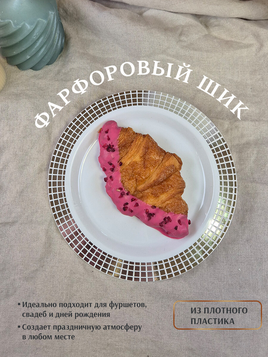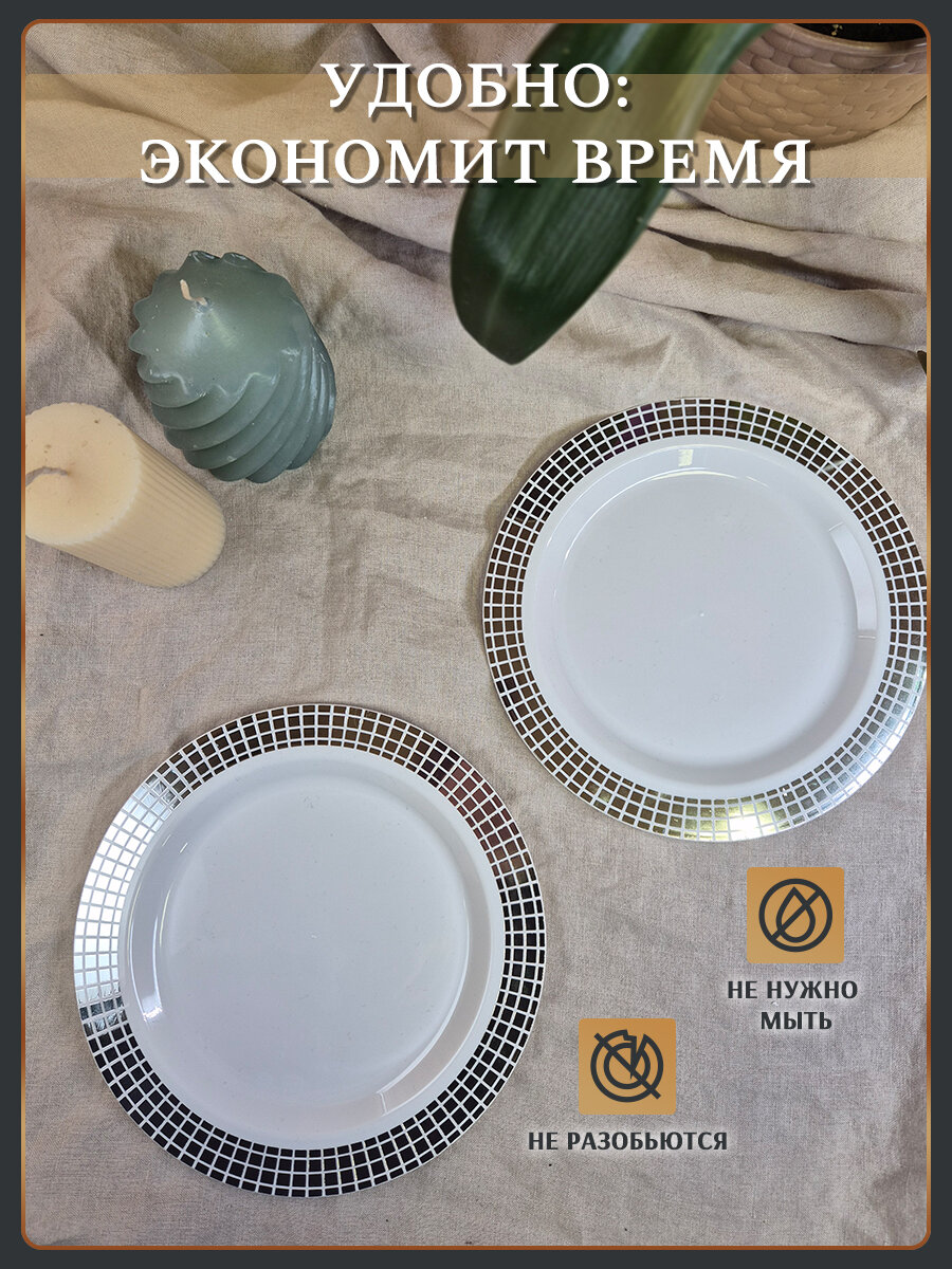 Отзывы на Тарелка одноразовая пластиковая диаметр 19 см с металлизированной каймой кубики серебро 10 штук