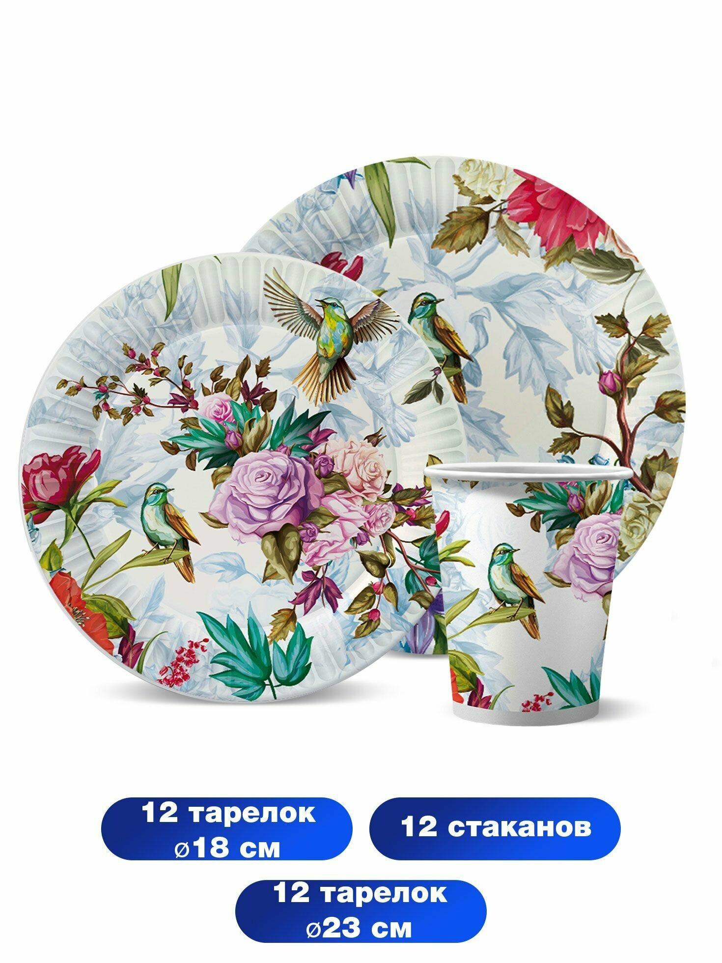 Набор одноразовой бумажной посуды для праздника ND Play / Птицы и цветы (тарелка 18 см, тарелка 23 см, стакан 250 мл, по 6 шт.), 298782 информация: