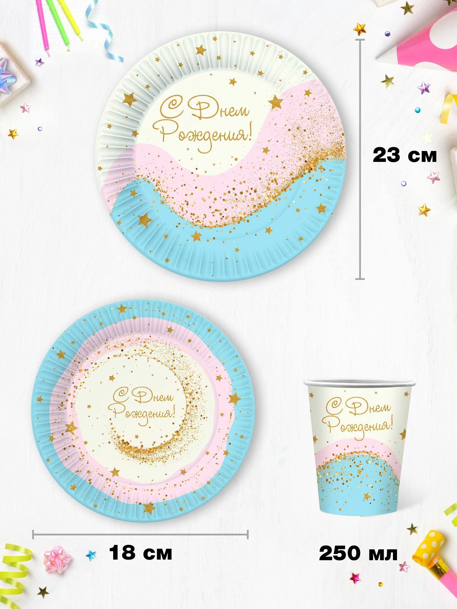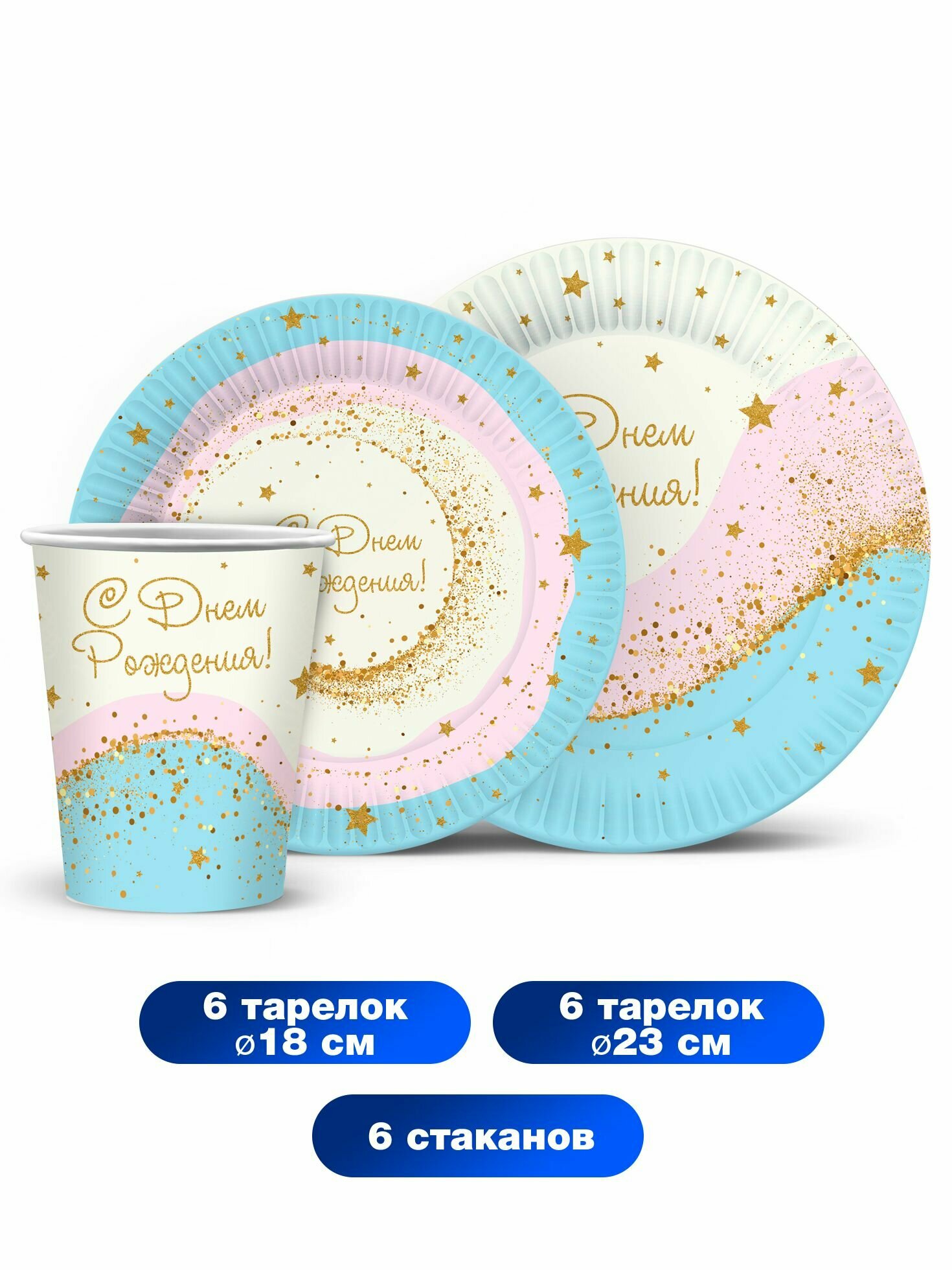 Набор одноразовой бумажной посуды для праздника ND Play / Воздушный зефир (тарелка 18 см, тарелка 23 см, стакан, по 6 шт.) информация:
