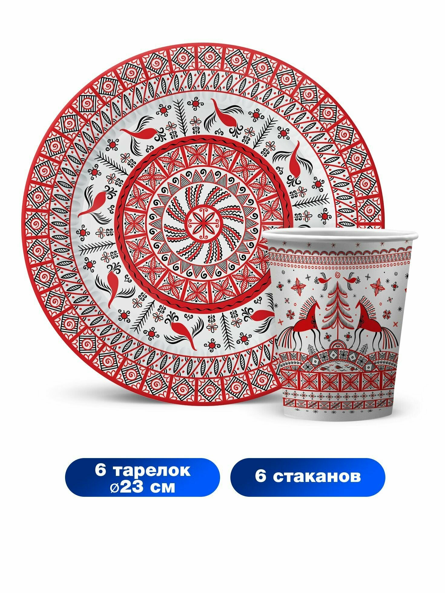Набор одноразовой бумажной посуды для праздника ND Play. Мезенская роспись (стакан, тарелка 23 см, по 6 шт.) информация: